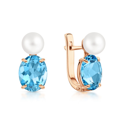 Серьги с 2 топазами свисс природными, 4.09 карат; 2 жемчугами пресноводными культ.белыми, 1.84 карат; Розовое золото 585 пробы.