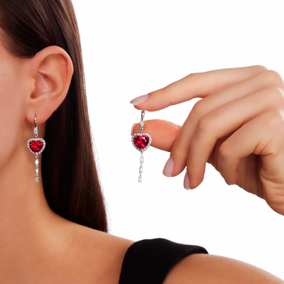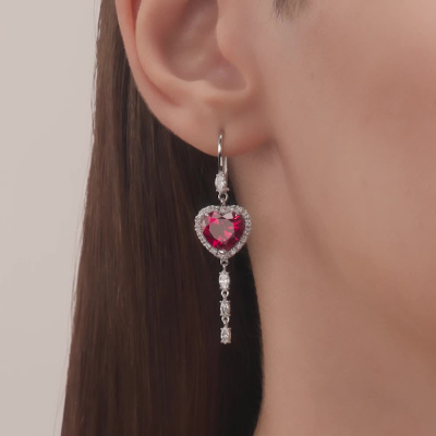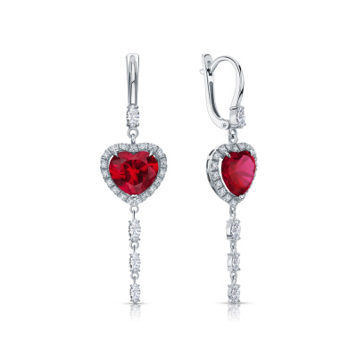 Серьги с 2 рубинами выращенными, 7.94 карат; 4 бриллиантами выращенными, 0.46 карат, огранка маркиз 55 граней, цвет 3, чистота 5, тип огранки А; 4 бриллиантами выращенными, 0.26 карат, огранка маркиз 55 граней, цвет 3, чистота 5, тип огранки А; 38 бриллиантами выращенными, 0.26 карат, огранка круг 57 граней, цвет 3, чистота 5, тип огранки А; Белое золото 585 пробы.
