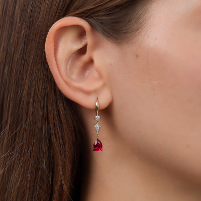 Серьги с 2 рубинами выращенными, 2.81 карат; 2 бриллиантами выращенными, 0.2 карат, огранка круг 57 граней, цвет 3, чистота 6, тип огранки А; 4 бриллиантами выращенными, 0.01 карат, огранка круг 57 граней, цвет 3, чистота 6, тип огранки А; 8 бриллиантами выращенными, 0.01 карат, огранка круг 57 граней, цвет 3, чистота 6, тип огранки А; Желтое золото 585 пробы.