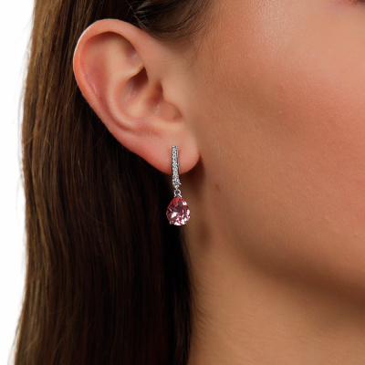 Серьги с 2 розовыми сапфирами выращенными, 6.42 карат; 2 бриллиантами выращенными, 0.23 карат, огранка маркиз 55 граней, цвет 3, чистота 5, тип огранки А; 12 бриллиантами выращенными, 0.09 карат, огранка круг 57 граней, цвет 3, чистота 5, тип огранки А; Белое золото 585 пробы.