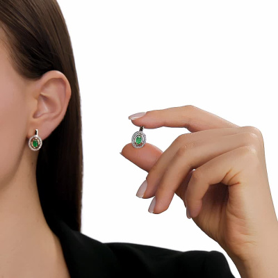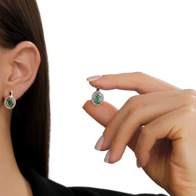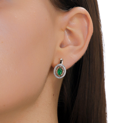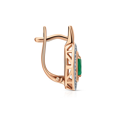 Серьги с 62 бриллиантами природными, 0.15 карат, огранка круг 17 граней, цвет 2, чистота 2, тип огранки А; 2 изумрудами природными, 0.8 карат, цвет 3, чистота 3, тип огранки Б; Розовое золото 585 пробы.