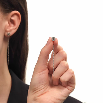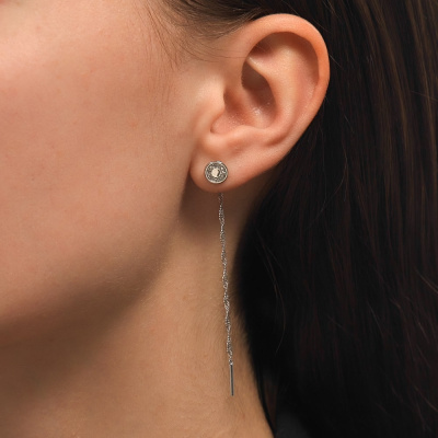 Серьги с 22 бриллиантами природными, 0.09 карат, огранка круг 17 граней, цвет 2, чистота 2, тип огранки Б; Белое золото 585 пробы.