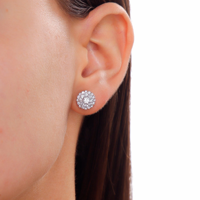 Серьги с 2 бриллиантами выращенными, 0.33 карат, огранка круг 57 граней, цвет 3, чистота 6, тип огранки А; 16 бриллиантами выращенными, 0.45 карат, огранка круг 57 граней, цвет 3, чистота 6, тип огранки А; 16 бриллиантами выращенными, 0.22 карат, огранка круг 57 граней, цвет 3, чистота 6, тип огранки А; 16 бриллиантами выращенными, 0.09 карат, огранка круг 57 граней, цвет 3, чистота 6, тип огранки А; Белое золото 585 пробы.