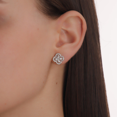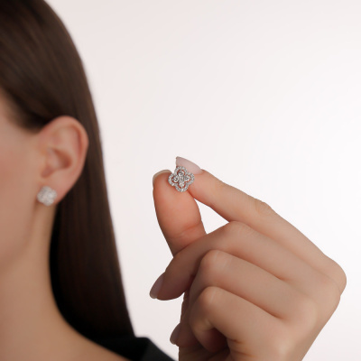 Серьги с 8 бриллиантами выращенными, 0.63 карат, огранка круг 57 граней, цвет 3, чистота 5, тип огранки А; 2 бриллиантами выращенными, 0.04 карат, огранка круг 57 граней, цвет 3, чистота 5, тип огранки А; 48 бриллиантами выращенными, 0.34 карат, огранка круг 57 граней, цвет 3, чистота 5, тип огранки А; Белое золото 585 пробы.