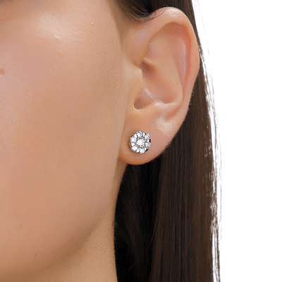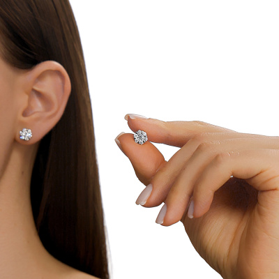 Серьги с 2 бриллиантами выращенными, 0.4 карат, огранка круг 57 граней, цвет 3, чистота 5, тип огранки А; 12 бриллиантами выращенными, 0.5 карат, огранка круг 57 граней, цвет 3, чистота 5, тип огранки А; Белое золото 585 пробы.