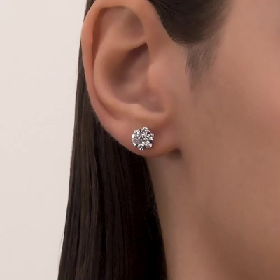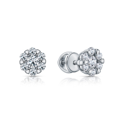 Серьги с 2 бриллиантами выращенными, 0.38 карат, огранка круг 57 граней, цвет 3, чистота 6, тип огранки А; 12 бриллиантами выращенными, 0.54 карат, огранка круг 57 граней, цвет 3, чистота 6, тип огранки А; Белое золото 585 пробы.