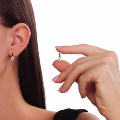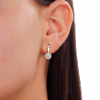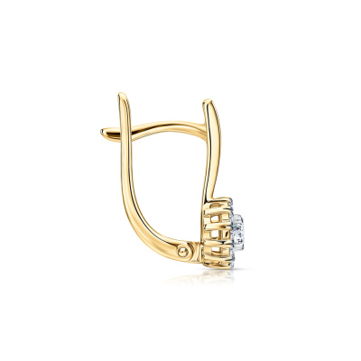 Серьги с 2 бриллиантами выращенными, 0.25 карат, огранка круг 57 граней, цвет 3, чистота 6, тип огранки А; 24 бриллиантами выращенными, 0.18 карат, огранка круг 57 граней, цвет 3, чистота 6, тип огранки А; Желтое золото 585 пробы.