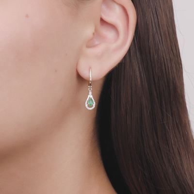 Серьги с 34 бриллиантами природными, 0.06 карат, огранка круг 17 граней, цвет 2, чистота 2, тип огранки А; 2 изумрудами природными, 0.34 карат, цвет 3, чистота 3, тип огранки Б; Желтое золото 585 пробы.