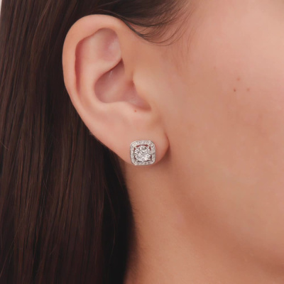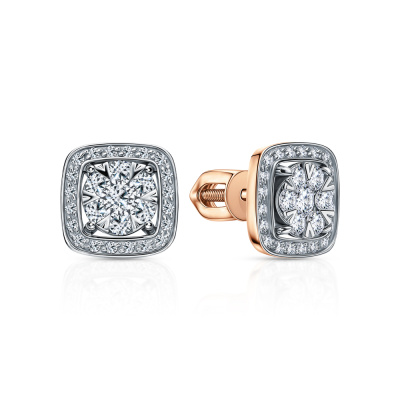 Серьги с 2 бриллиантами природными, 0.13 карат, огранка круг 57 граней, цвет 3, чистота 6, тип огранки А; 12 бриллиантами природными, 0.37 карат, огранка круг 57 граней, цвет 3, чистота 6, тип огранки А; 40 бриллиантами природными, 0.16 карат, огранка круг 17 граней, цвет 2, чистота 2, тип огранки А; Розовое и белое золото 585 пробы.