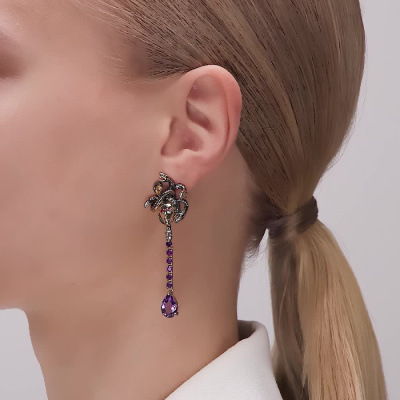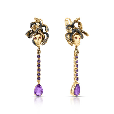 Серьги с 2 аметистами природными, 3.45 карат, тип огранки А; 12 аметистами природными, 0.76 карат, тип огранки А; 4 рубинами природными, 0.04 карат, цвет 2, чистота 2, тип огранки А; 12 бриллиантами коричневыми природными, 0.1 карат, огранка круг 57 граней, цвет 7, чистота 5, тип огранки А; 86 бриллиантами коричневыми природными, 0.45 карат, огранка круг 57 граней, цвет 7, чистота 6, тип огранки А; Желтое золото 585 пробы.