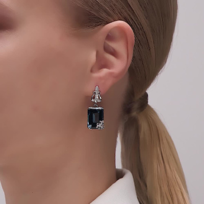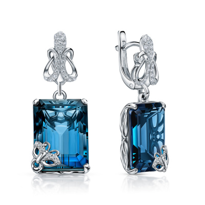 Серьги с 4 бриллиантами природными, 0.03 карат, огранка круг 57 граней, цвет 3, чистота 5, тип огранки А; 54 бриллиантами природными, 0.24 карат, огранка круг 57 граней, цвет 3, чистота 5, тип огранки А; 2 топазами лондон природными, 27.3 карат, тип огранки А; Белое золото 585 пробы.