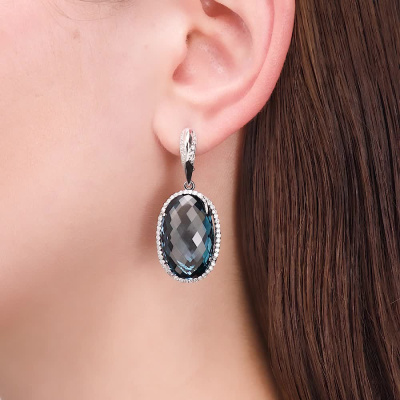 Серьги с 100 бриллиантами природными, 0.73 карат, огранка круг 57 граней, цвет 3, чистота 5, тип огранки А; 8 бриллиантами природными, 0.04 карат, огранка круг 57 граней, цвет 3, чистота 5, тип огранки А; 2 топазами лондон природными, 55.67 карат, тип огранки А; Белое золото 585 пробы.
