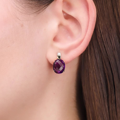 Серьги с 2 бриллиантами природными, 0.05 карат, огранка круг 57 граней, цвет 3, чистота 5, тип огранки А; 2 аметистами природными, 10.16 карат, тип огранки А; Желтое золото 585 пробы.