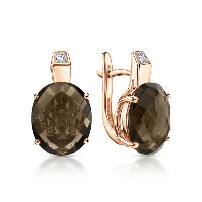 Серьги с 2 бриллиантами природными, 0.04 карат, огранка круг 57 граней, цвет 3, чистота 6, тип огранки А; 2 кварцами дымчатыми природными, 9.24 карат, тип огранки А; Розовое золото 585 пробы.
