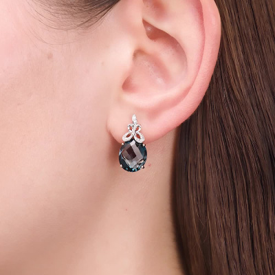 Серьги с 8 бриллиантами природными, 0.04 карат, огранка круг 57 граней, цвет 3, чистота 5, тип огранки А; 2 топазами лондон природными, 10.46 карат, тип огранки А; золото 585 пробы.