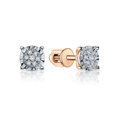 Серьги с 2 бриллиантами природными, 0.01 карат, огранка круг 17 граней, цвет 2, чистота 2, тип огранки А; 12 бриллиантами природными, 0.05 карат, огранка круг 17 граней, цвет 2, чистота 2, тип огранки А; Розовое и белое золото 585 пробы.