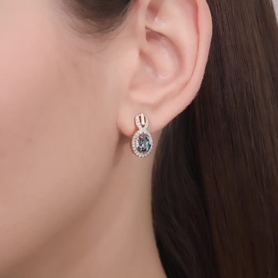 Серьги с 60 бриллиантами природными, 0.25 карат, огранка круг 17 граней, цвет 2, чистота 2; 2 топазами лондон природными, 1.05 карат; Розовое золото 585 пробы.