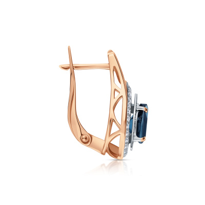 Серьги с 60 бриллиантами природными, 0.3 карат, огранка круг 17 граней, цвет 2, чистота 2; 2 топазами лондон природными, 1.58 карат; Розовое золото 585 пробы.