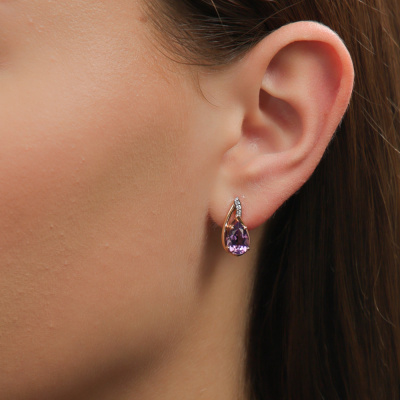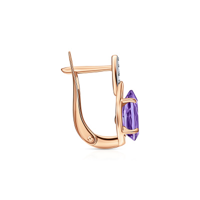 Серьги с 6 бриллиантами природными, 0.04 карат, огранка круг 57 граней, цвет 3, чистота 6; 2 аметистами природными, 2.27 карат; Розовое золото 585 пробы.