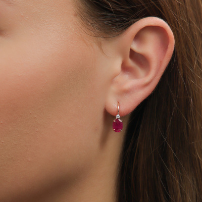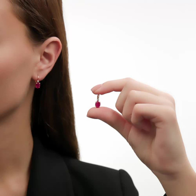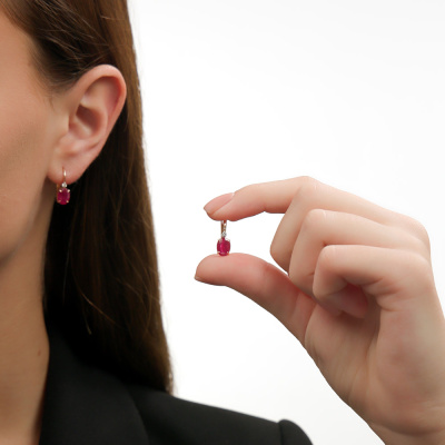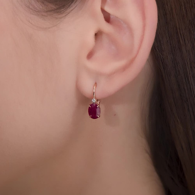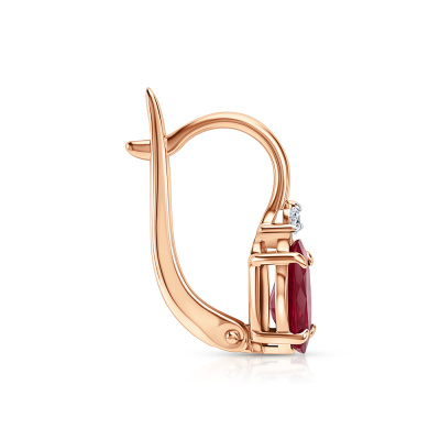 Серьги с 2 бриллиантами природными, 0.05 карат, огранка круг 57 граней, цвет 3, чистота 6, тип огранки А; 2 рубинами природными, 2.59 карат, цвет 2, чистота 2, тип огранки Б; Розовое золото 585 пробы.
