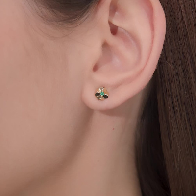 Серьги с 2 изумрудами природными, 0.05 карат, цвет 3, чистота 3, тип огранки В; Желтое золото 585 пробы.