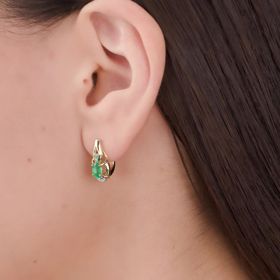 Серьги с 8 бриллиантами природными, 0.02 карат, огранка круг 17 граней, цвет 2, чистота 2, тип огранки А; 2 изумрудами природными, 0.76 карат, цвет 3, чистота 3, тип огранки Б; 2 изумрудами природными, 0.06 карат, цвет 3, чистота 3, тип огранки В; Желтое золото 585 пробы.