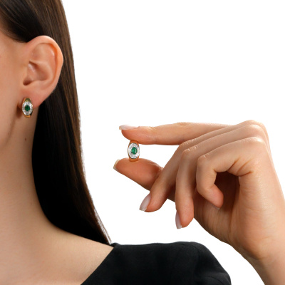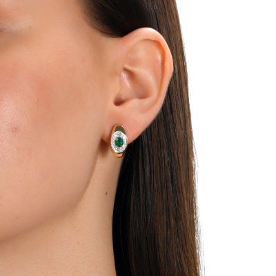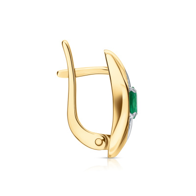 Серьги с 40 бриллиантами природными, 0.13 карат, огранка круг 17 граней, цвет 2, чистота 2, тип огранки А; 12 бриллиантами природными, 0.03 карат, огранка круг 17 граней, цвет 2, чистота 2, тип огранки А; 2 изумрудами природными, 0.56 карат, цвет 3, чистота 3, тип огранки Б; Желтое золото 585 пробы.