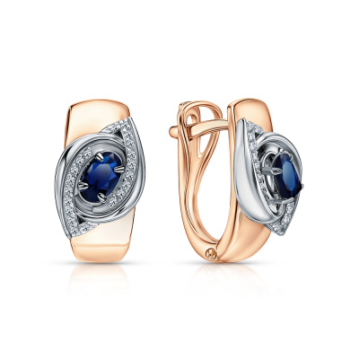 Серьги с 40 бриллиантами природными, 0.08 карат, огранка круг 17 граней, цвет 2, чистота 2, тип огранки А; 2 сапфирами природными, 0.55 карат, цвет 2, чистота 2, тип огранки Б; Розовое и белое золото 585 пробы.