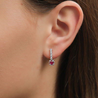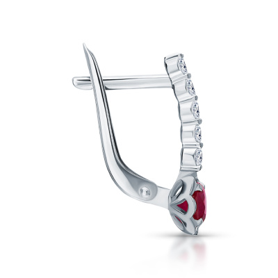 Серьги с 10 бриллиантами природными, 0.31 карат, огранка круг 57 граней, цвет 3, чистота 6, тип огранки А; 2 рубинами природными, 0.55 карат, цвет 2, чистота 2, тип огранки В; Белое золото 585 пробы.