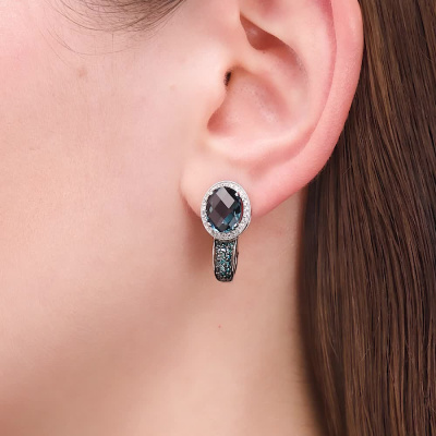 Серьги с 52 бриллиантами природными, 0.23 карат, огранка круг 57 граней, цвет 4, чистота 4, тип огранки А; 2 топазами лондон природными, 6 карат, тип огранки А; 42 бриллиантами синими природными облагороженными, 0.52 карат, огранка круг 57 граней, цвет 5, чистота 6, тип огранки А; Белое золото 585 пробы.