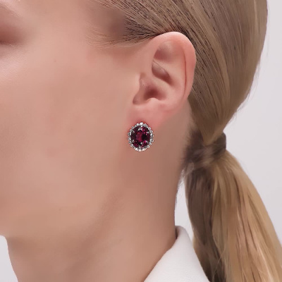 Серьги с 12 бриллиантами природными, 0.35 карат, огранка круг 57 граней, цвет 3, чистота 5, тип огранки А; 24 бриллиантами природными, 0.36 карат, огранка круг 57 граней, цвет 3, чистота 6, тип огранки А; 2 родолитами природными, 5.55 карат, тип огранки А; золото 585 пробы.