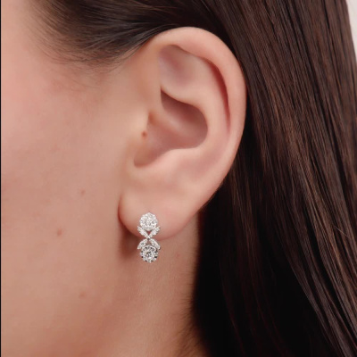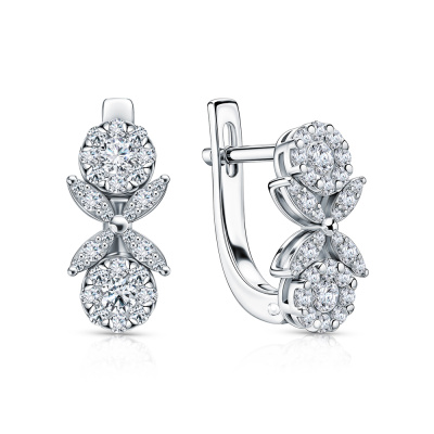 Серьги с 4 бриллиантами природными, 0.3 карат, огранка круг 57 граней, цвет 3, чистота 6, тип огранки А; 40 бриллиантами природными, 0.45 карат, огранка круг 57 граней, цвет 3, чистота 6, тип огранки А; 16 бриллиантами природными, 0.05 карат, огранка круг 57 граней, цвет 3, чистота 6, тип огранки А; Белое золото 585 пробы.