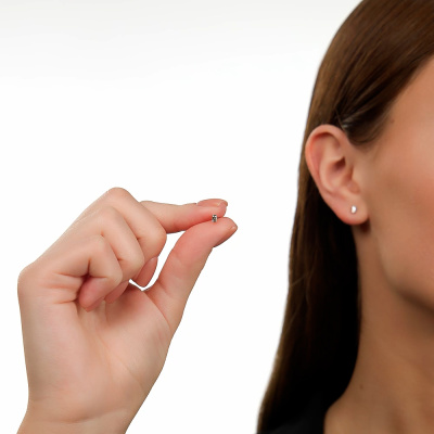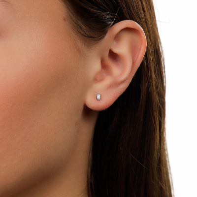 Серьги с 2 бриллиантами природными, 0.16 карат, огранка багет 25 граней, цвет 3, чистота 3, тип огранки А; Белое золото 585 пробы.