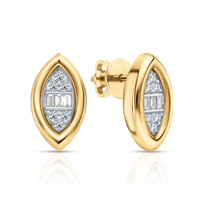 Серьги с 6 бриллиантами природными, 0.12 карат, огранка багет 33 грани, цвет 3, чистота 3, тип огранки А; 12 бриллиантами природными, 0.22 карат, огранка круг 57 граней, цвет 3, чистота 4, тип огранки А; Желтое золото 585 пробы.