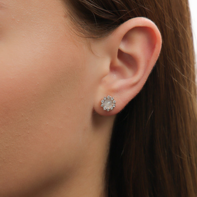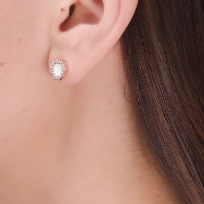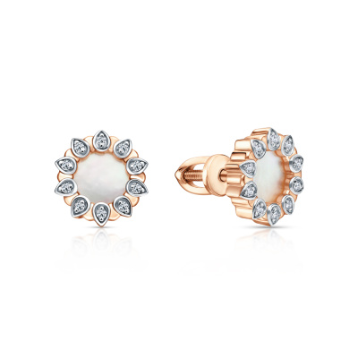 Серьги с 20 бриллиантами природными, 0.07 карат, огранка круг 17 граней, цвет 2, чистота 2, тип огранки А; 2 перламутрами белыми природными; Розовое золото 585 пробы.