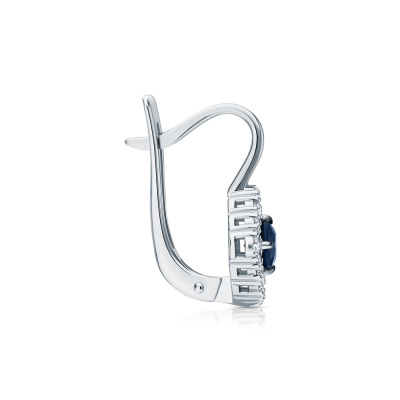 Серьги с 24 бриллиантами природными, 0.54 карат, огранка круг 57 граней, цвет 3, чистота 6, тип огранки А; 2 сапфирами природными, 0.55 карат, цвет 2, чистота 2, тип огранки В; Белое золото 585 пробы.
