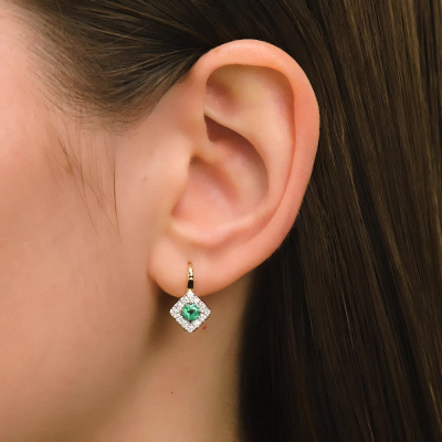 Серьги с 24 бриллиантами природными, 0.5 карат, огранка круг 57 граней, цвет 3, чистота 6, тип огранки А; 2 изумрудами природными, 0.43 карат, цвет 3, чистота 3, тип огранки В; Желтое золото 585 пробы.