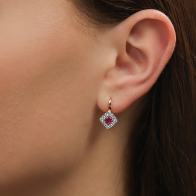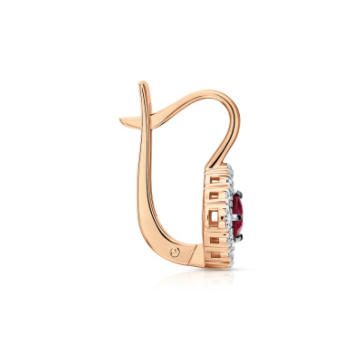 Серьги с 24 бриллиантами природными, 0.54 карат, огранка круг 57 граней, цвет 3, чистота 6, тип огранки А; 2 рубинами природными, 0.64 карат, цвет 2, чистота 2, тип огранки В; Розовое золото 585 пробы.