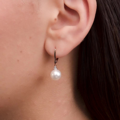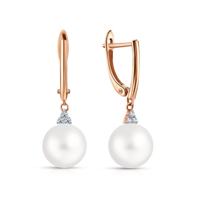 Серьги с 6 бриллиантами природными, 0.05 карат, огранка круг 17 граней, цвет 2, чистота 2, тип огранки А; 2 жемчугами пресноводными культ.белыми; Розовое золото 585 пробы.