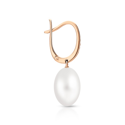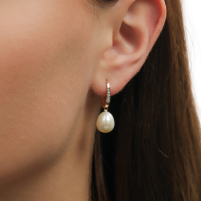Серьги с 8 бриллиантами природными, 0.03 карат, огранка круг 17 граней, цвет 2, чистота 2, тип огранки А; 2 жемчугами пресноводными культ.белыми; Розовое золото 585 пробы.