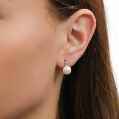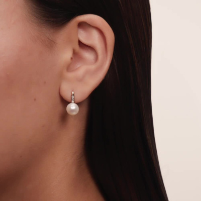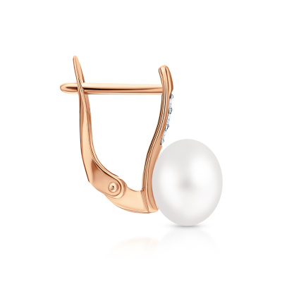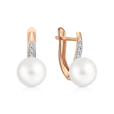 Серьги с 6 бриллиантами природными, 0.04 карат, огранка круг 17 граней, цвет 2, чистота 2, тип огранки А; 2 жемчугами пресноводными культ.белыми; Розовое золото 585 пробы.