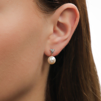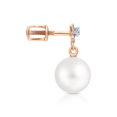 Серьги с 6 бриллиантами природными, 0.02 карат, огранка круг 17 граней, цвет 2, чистота 2, тип огранки А; 2 топазами бесцветными природными, 0.01 карат; 2 жемчугами пресноводными культ.белыми; Розовое золото 585 пробы.