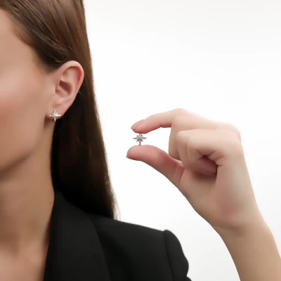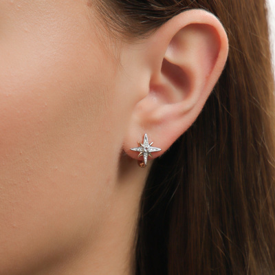 Серьги с 24 бриллиантами природными, 0.04 карат, огранка круг 17 граней, цвет 2, чистота 2, тип огранки А; 2 топазами бесцветными природными, 0.08 карат; Розовое золото 585 пробы.