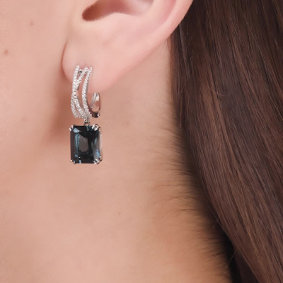 Серьги с 84 бриллиантами природными, 0.33 карат, огранка круг 17 граней, цвет 2, чистота 2, тип огранки А; 2 топазами лондон природными, 14.18 карат; Белое золото 585 пробы.