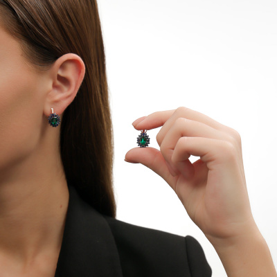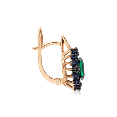 Серьги с 2 гидротермальными изумрудами, 1.27 карат; 8 сапфирами синтетическими, 0.44 карат; 16 сапфирами синтетическими, 0.46 карат; 24 сапфирами синтетическими, 0.48 карат; Розовое золото 585 пробы.