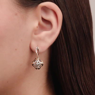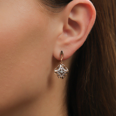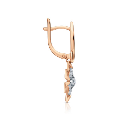 Серьги с 2 бриллиантами природными, 0.07 карат, огранка круг 57 граней, цвет 3, чистота 6, тип огранки А; 40 бриллиантами природными, 0.08 карат, огранка круг 17 граней, цвет 2, чистота 2, тип огранки А; Розовое и белое золото 585 пробы.