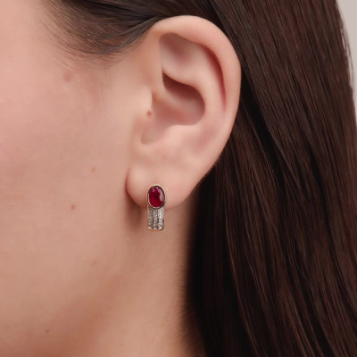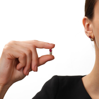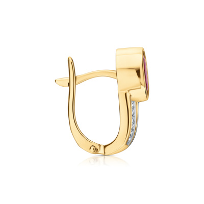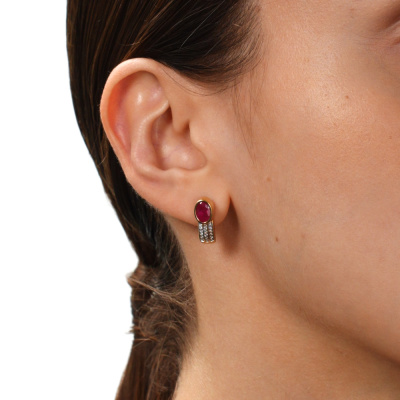 Серьги с 36 бриллиантами природными, 0.09 карат, огранка круг 17 граней, цвет 2, чистота 2, тип огранки А; 2 рубинами природными, 1.73 карат, цвет 2, чистота 2, тип огранки Б; Желтое золото 585 пробы.
