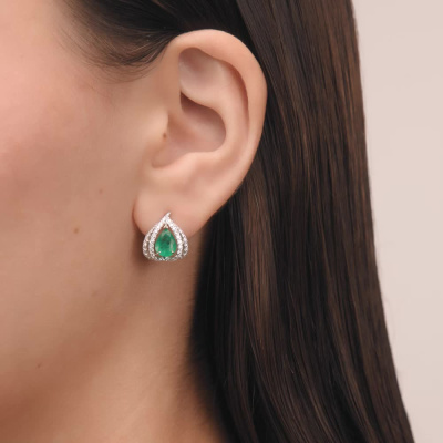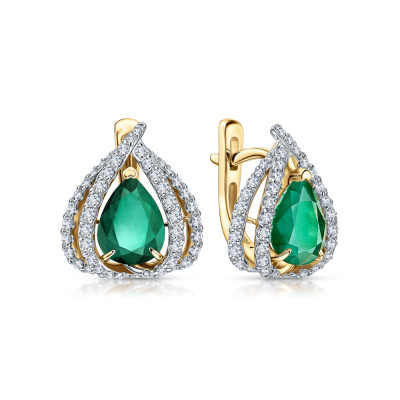 Серьги с 40 бриллиантами природными, 0.31 карат, огранка круг 57 граней, цвет 3, чистота 6, тип огранки А; 34 бриллиантами природными, 0.2 карат, огранка круг 57 граней, цвет 3, чистота 6, тип огранки А; 22 бриллиантами природными, 0.06 карат, огранка круг 17 граней, цвет 2, чистота 2, тип огранки А; 2 изумрудами природными, 2.01 карат, цвет 3, чистота 3, тип огранки Б; Желтое золото 585 пробы.