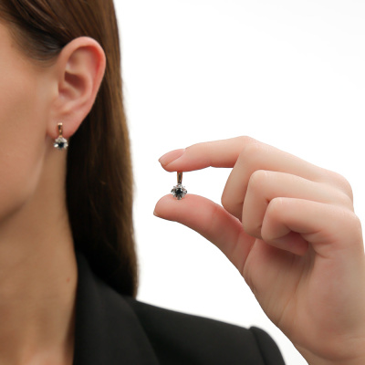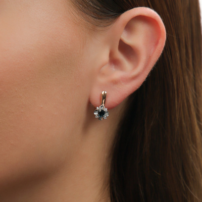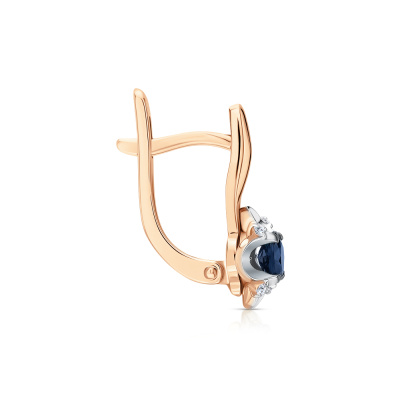 Серьги с 8 бриллиантами природными, 0.05 карат, огранка круг 57 граней, цвет 3, чистота 6, тип огранки А; 8 бриллиантами природными, 0.03 карат, огранка круг 17 граней, цвет 2, чистота 2, тип огранки А; 2 сапфирами природными, 0.57 карат, цвет 2, чистота 2, тип огранки В; Розовое и белое золото 585 пробы.