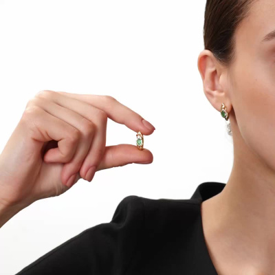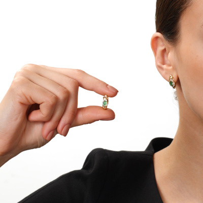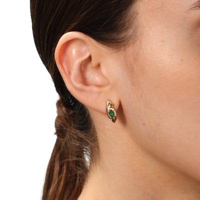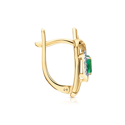 Серьги с 14 бриллиантами природными, 0.03 карат, огранка круг 17 граней, цвет 2, чистота 2, тип огранки А; 2 изумрудами природными, 0.4 карат, цвет 3, чистота 3, тип огранки Б; Желтое золото 585 пробы.